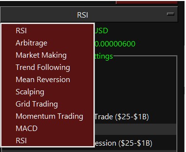 Measures the speed and change of price movements to identify when an asset is oversold (too cheap) or overbought (too expensive). The bot buys when RSI drops below your Oversold level (default 30) and sells when it rises above Overbought (default 70). It can safely accumulate up to 5 buys before waiting for the sell signal and flattening the entire position in one profitable exit. Perfect for spotting reversals in volatile markets.