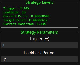 Chases explosive price action and volume spikes. The bot buys instantly when price surges past your set trigger percentage in the lookback period and sells when momentum reverses. Perfect for catching fast-moving altcoin rallies on any of the three supported exchanges.