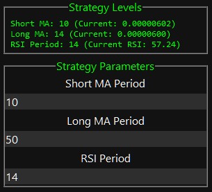 A conservative, multi-confirmation strategy that only enters confirmed uptrends. It waits for the short-term moving average to cross above the long-term average while RSI stays healthy (not overheated). The bot buys into the trend and sells when the short average crosses back below the long average. Ideal for strong bull markets.